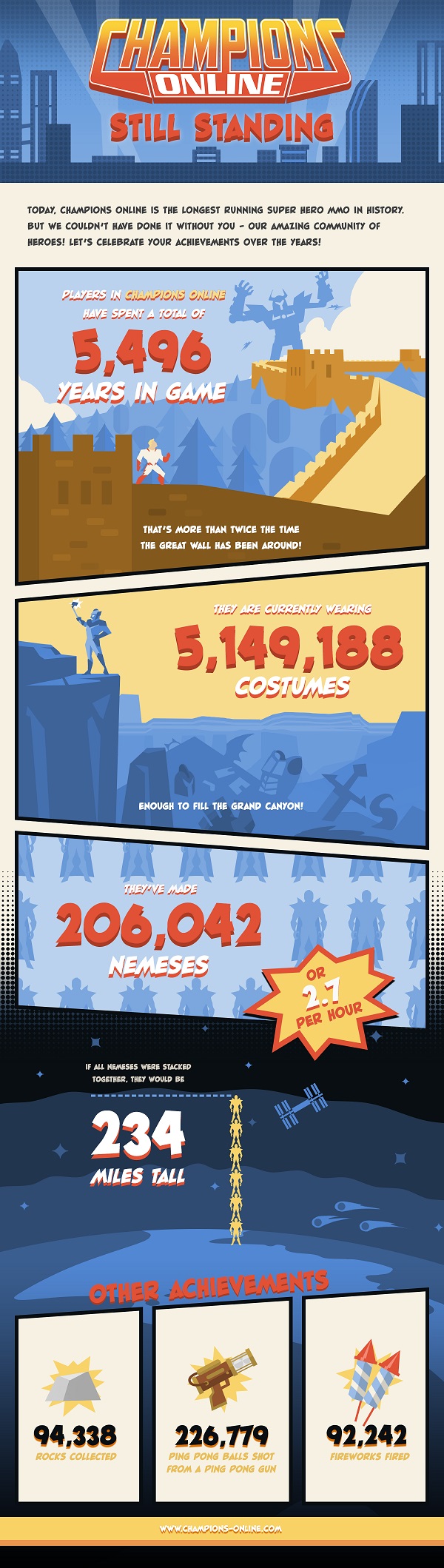 Perfect World Entertainment and Cryptic Studios today announced that Champions Online has surpassed an important milestone, becoming the longest-running superhero MMORPG. It launched on Sept. 1, 2009, making it nine years, seven months, and 22 days old, surpassing the nine years, seven months, and three days that Cryptic's City of Heroes was live. That comparison won't ruffle a few feathers, now, will it?